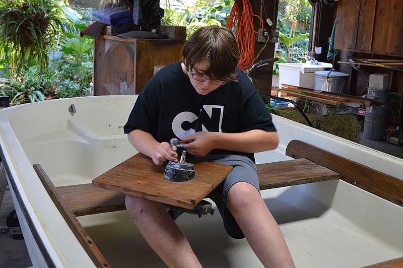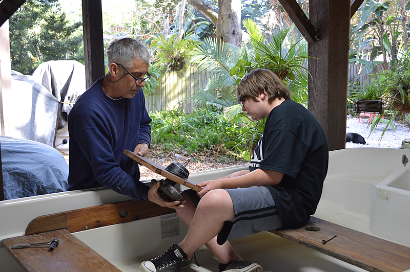 My late good friend, Rod Gorman, had a 13.5 Whaler that had been torn up pretty good in a storm and been sitting in the water for awhile. He offered it to my youngest, Connor, if he was willing to put in the time and effort to restore her sea legs.