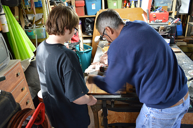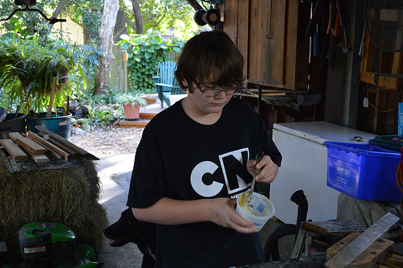 Next we were off on a field trip to Fiberglass Coatings, the DIY fiberglass experts, where we found all of the help/advice/materials that anyone could want. As Nick had some material left from his last build all we needed was some putty, activator, acetone, resin, a few cups, scrapers and brushes. The first application was just the putty, and on the second we mixed some loose glass in. As you can see, it was so much fun that Mr. Jim's youngest David just had to jump in.