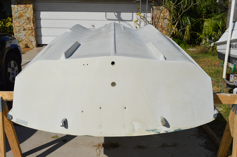 Off to Mr. Nick's shop where he taped it up and shot fresh gelcoat over the repaired areas. He mixed yellow and black pigments to come up with a very close match to the existing color (a far cry from the original white).